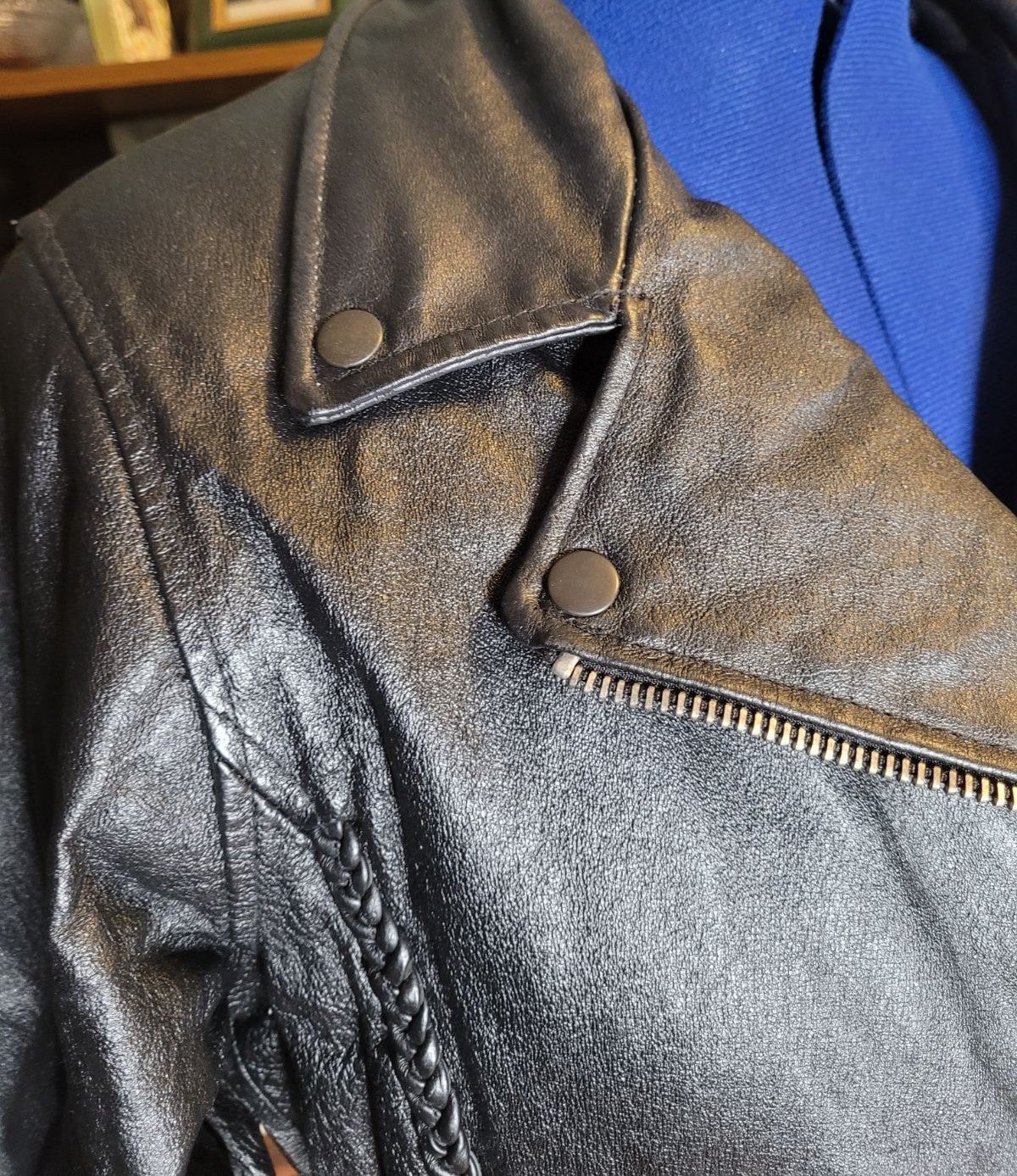 Made by Vilanto . Zippers on the sleeves. Leather braids going down the sides. Very nice jacket. No flaws.